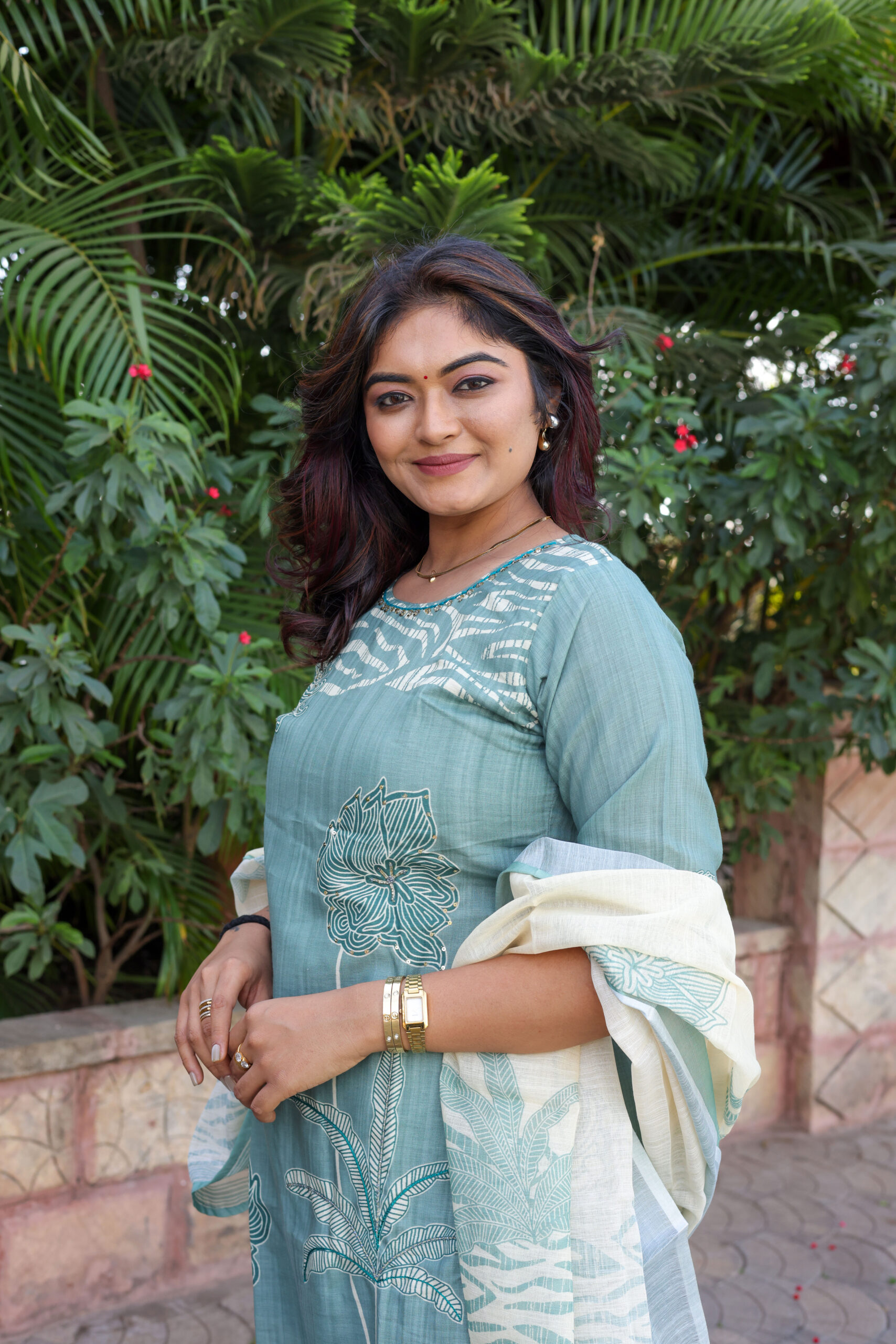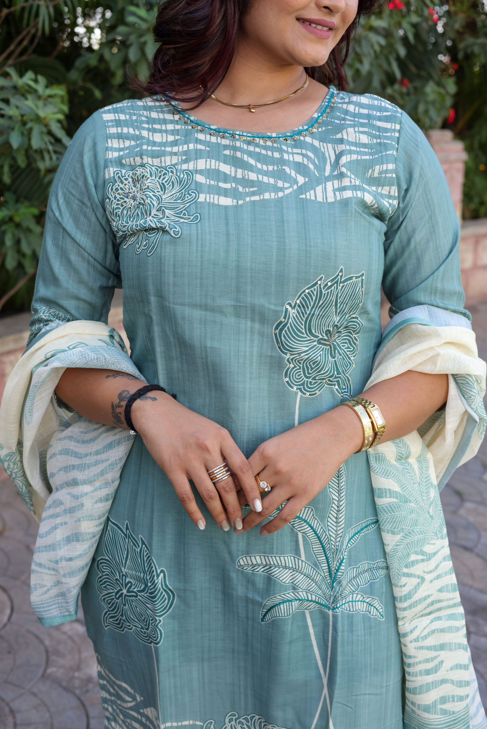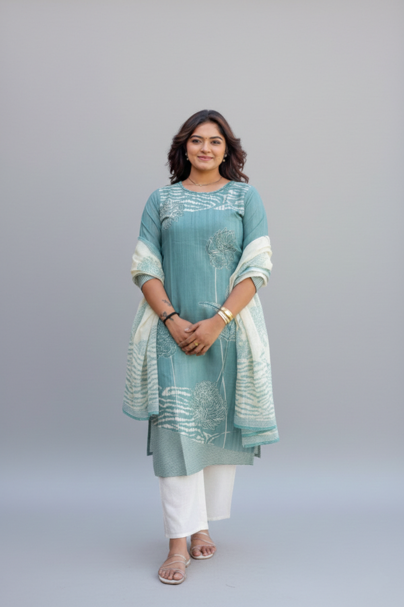 | Color Palette | Sea Green (Kurta) & Off-White (Trousers/Dupatta) |