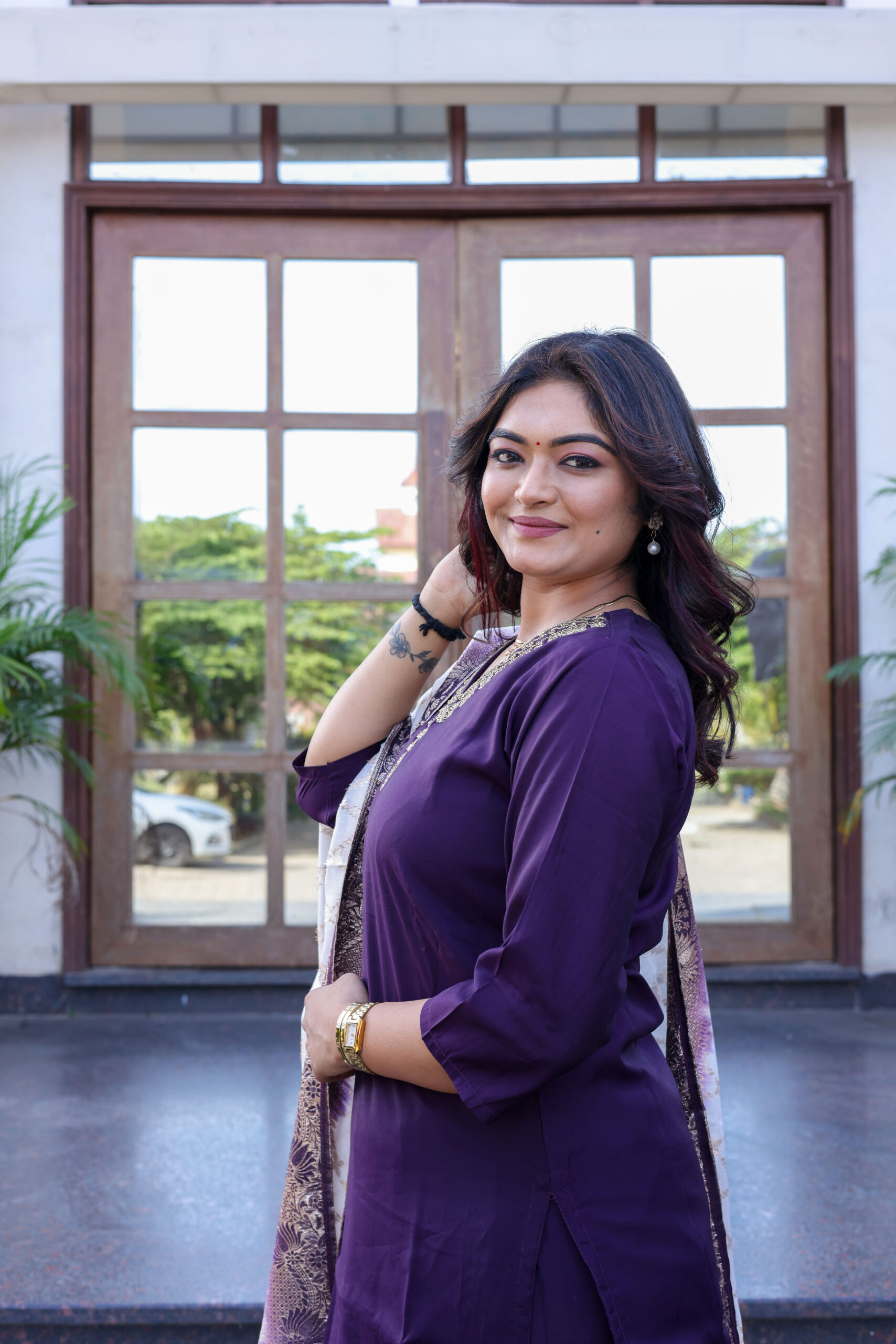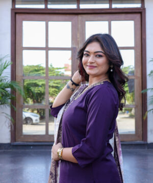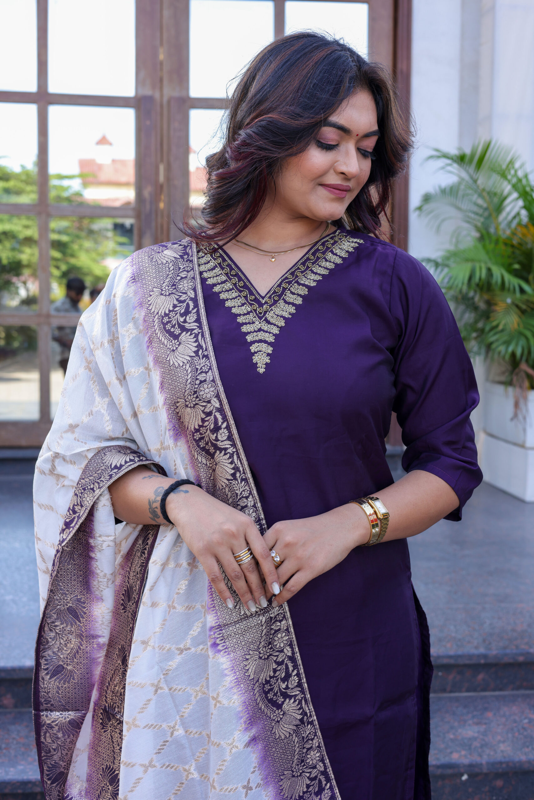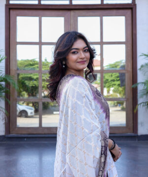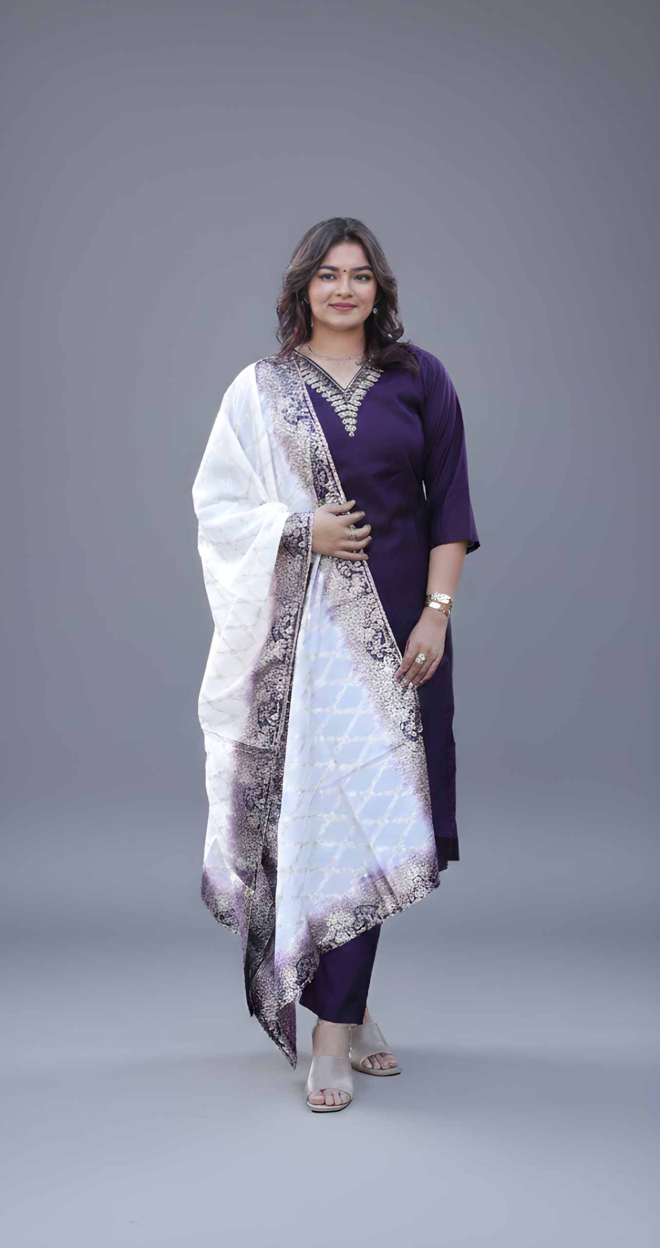 | Kurta Style | Straight-cut silhouette with V-neckline and intricate floral thread-work embroidery. |