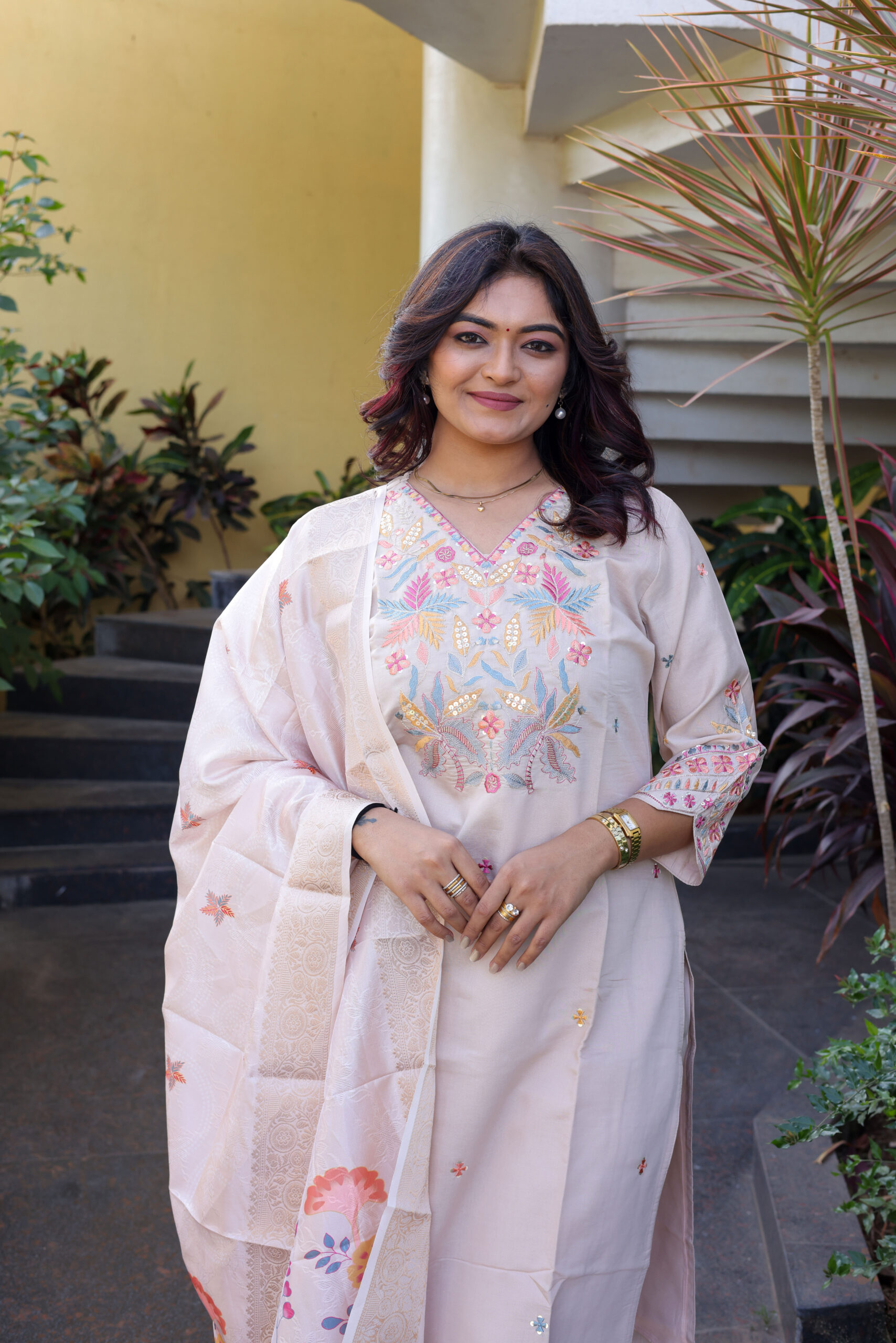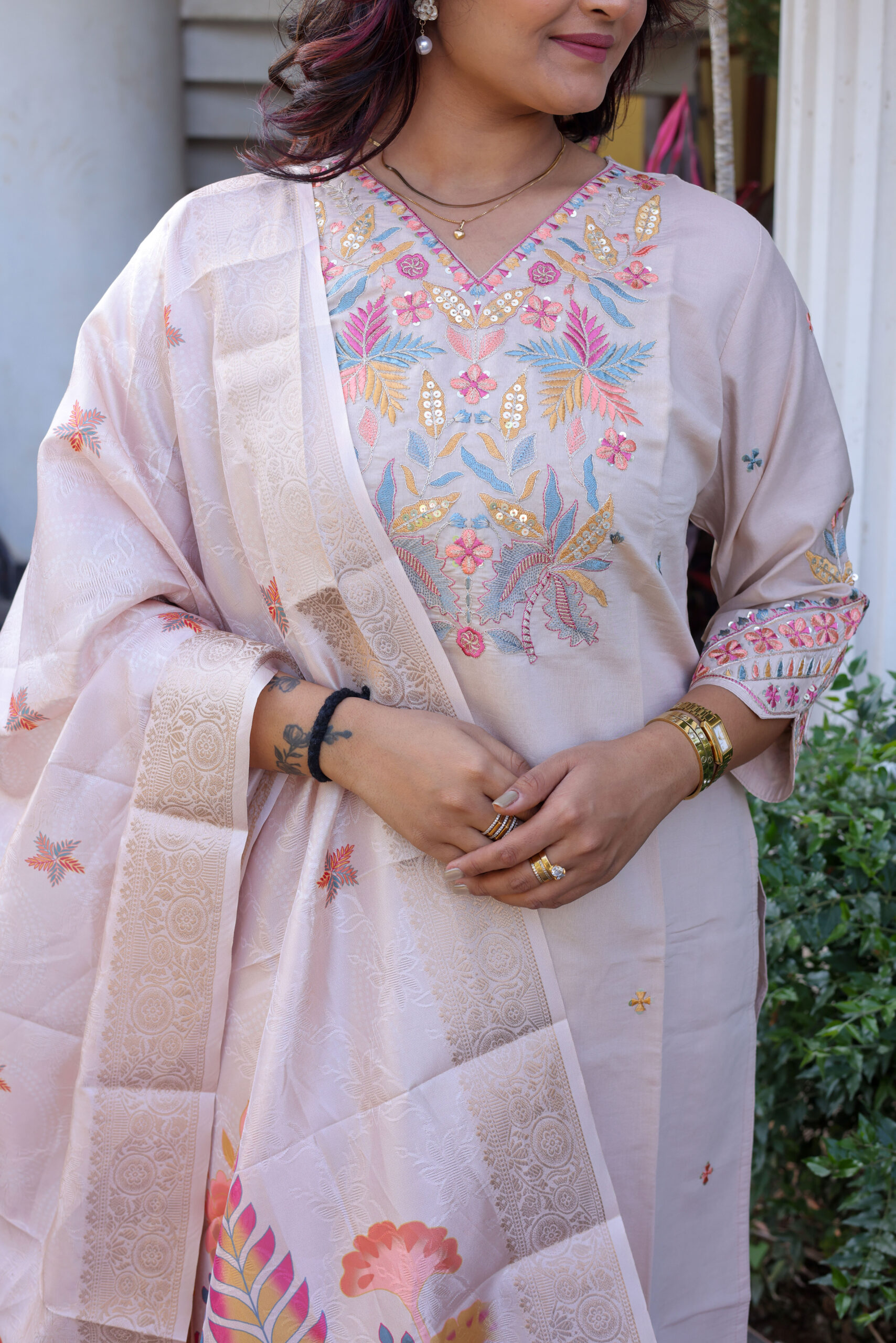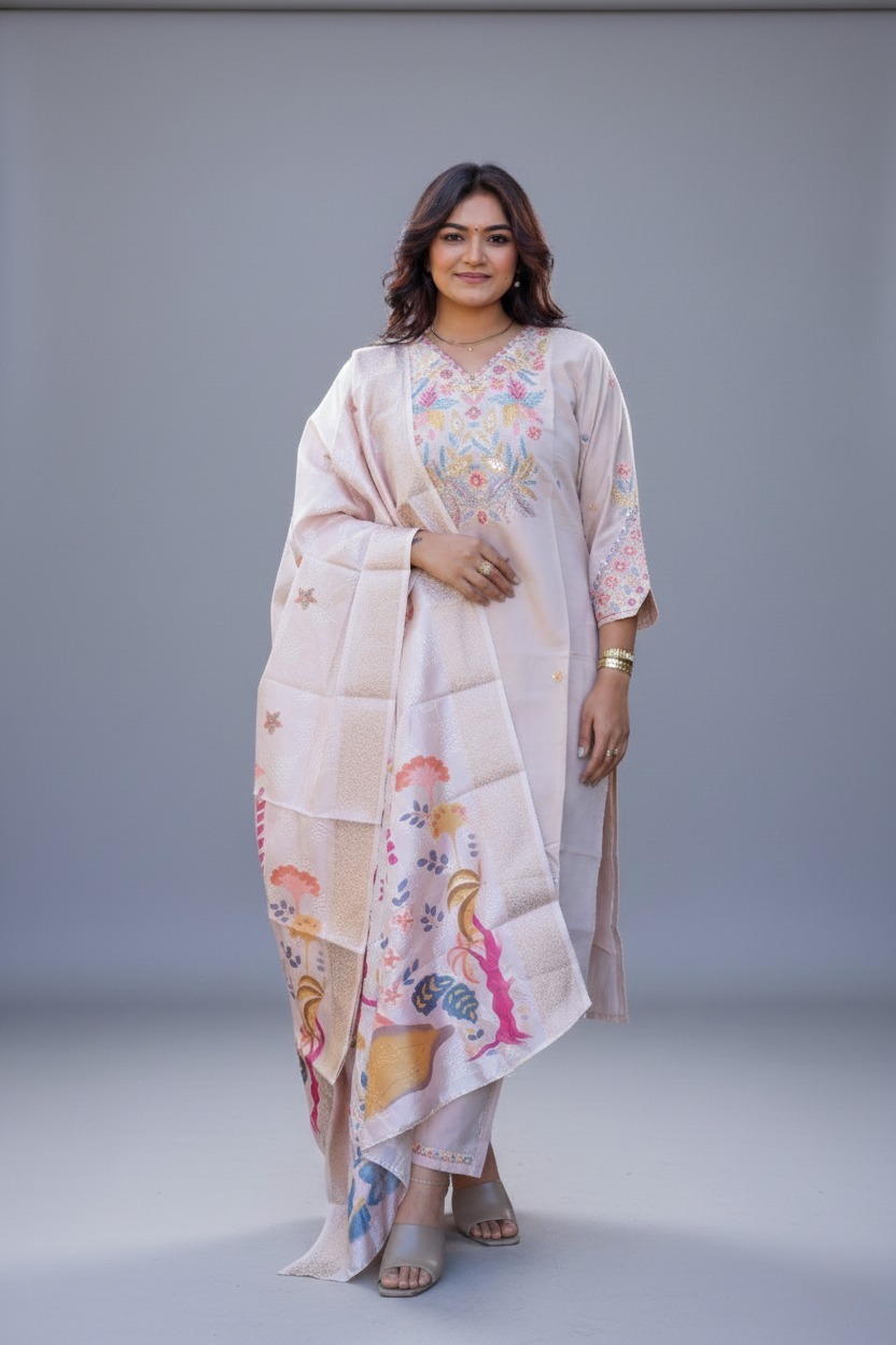 | Dupatta | Silk-blend dupatta featuring traditional botanical prints and a subtle sheen. |